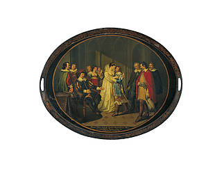 Ovales Tablett mit ausgesparten Handhaben, schwarz lackiert. Fahne mit goldfarbenem Floralornament. In goldfarben eingefaßtem Spiegel im Oval: Historienmalerei mit der Rückkehr des Kurprinzen Friedrich Wilhelm aus den Niederlanden, nach einem Gemälde von Johann Carl Heinrich Kretschmar (1769-1847).