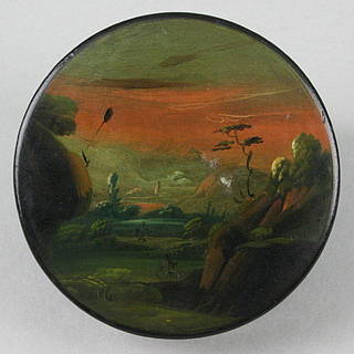 Kleine, runde Dose mit einer Phantasielandschaft bei Abendrot. Blick durch zwei Felsblöcke in ein weites Tal. Anmerkung: Dosen mit einfach gehaltener Malerei wurden von Stobwasser und von Evers Nachfolgern in Wolfenbüttel im Dutzend zusammengefaßt zu relativ niedrigen Preisen verkauft.