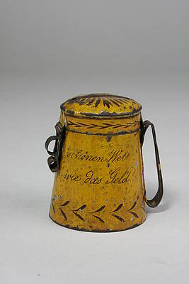 Runde Spardose mit zylindrischem Korpus und leicht gewölbtem Deckel mit Einwurfschlitz für das Geld, gelb lackiert. Haltegriff Lasche für ein Vorhängeschloß unlackiert. Dekor mit Blattkränzen. Auf der Wandung Devise in brauner Schreibschrift (s.o.).