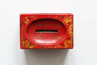 Kastenförmige Spardose mit vertieftem Münzeinwurfschlitz in ovalförmiger Mulde. Rot lackiert mit goldfarbenen Floralornamenten.