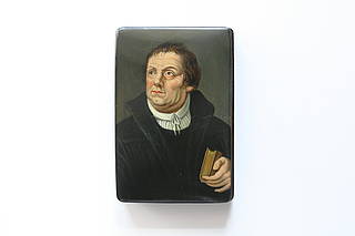 Rechteckige Dose mit einem Brustbild des Kirchenreformators Martin Luther (1483-1546) mit einer Bibel in der Hand. Malerei nach einem Gemälde von Lucas Cranach d. Ä. (1472-1553).