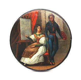 Runde Dose mit doppeltem Boden. Auf dem Deckel: Maleratelier mit jungem Maler mit Farbpalette in der Hand sowie vor einer Staffelei sitzende, junge Frau in Biedermeierkleid mit weiten Puffärmeln und Schürze, die einen Stift in der Hand hält und etwas auf die Leinwand zeichnet. Im Hintergrund geraffter Vorhang. Im doppelten Boden: Erotische Szene im Boudoir.