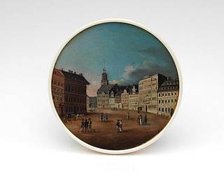 Runde Dose, gedrechselter Elfenbeinkorpus mit eingelegtem Stobwasser-Dosendeckel. Montierung mit Elfenbein später. Auf dem Deckel: Blick auf den Roßmarkt in Frankfurt mit Personen- und Tierstaffage. Im Hintergrund Turm der Karlskirche.