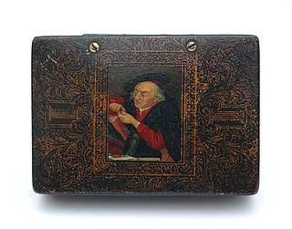 Rechteckige Dose, tiefdunkelbraun lackiert. Rundum mit floraler Goldornamentik dekoriert. Auf dem Deckel im Recheckfeld: Ein älterer Mann mit Barrett in einer Schreibstube beim Zuspitzen eines Federkiels am Schreibpult. Malerei nach einer Stichvorlage von Albert Henry Payne nach dem Gemälde "Der alte Schulmeister" von Gerard Dou (1613-1675).