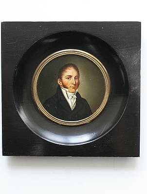 Runder Schnupftabaksdosendeckel mit einem Bildnis eines unbekannten Herrn mit dunklem Rock, Stehkragen und weißem Halstuch mit Schleife. Holzrahmen mit vergoldetem Metallreif aus der Zeit.