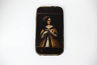 Rechteckiges Brillenetui mit stark abgerundeten Ecken. Deckblatt schwarz lackiert. Im mit Goldleisten gerahmten Bildfeld: Junge Frau mit weitem Mantel, Federbusch im Haar und Schale in ihren mit Handschuhen bekleideten Händen. Dunkler, neutraler Hintergrund. Bodenplatte schwarz mit Goldbläschendekor. Korpus und ausziehbares Brillenfuteral aus geprägtem Leder.