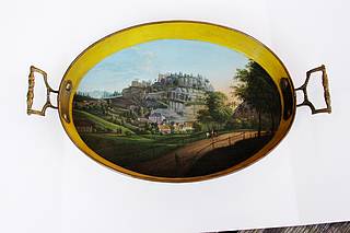 Ovales Tablett, gelb lackiert. Tabletteinfassung, Griffbefestigungsplatten und Nieten aus vergoldetem Metall; Griffe vergoldete Bronze. Im Spiegel: Blick auf den Berg Oybin am Fuß des Zittauer Gebirges mit Burgruine und Cölestinerkloster vom "Hochwald" aus. Im Vordergrund Personen- und Tierstaffage.