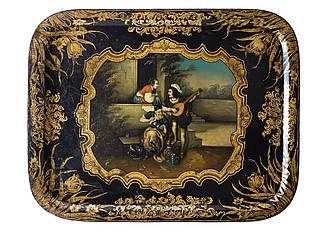 Rechteckiges Tablett mit abgerundeten Ecken, schwarz lackiert. Rand und Spiegel mit reichem Floraldekor in Gold. Im Zentrum des Spiegels in gotisierender Kartusche: Hauseingang mit jungem Landsknecht mit Mandoline, der seiner Angebeteten, die auf einem Mauersims hockt und einen Blumenstrauß in Händen hält, ein Ständchen bringt. Vor ihnen der vor einer Mauer auf einer Bank sitzende Vater des Mädchens beim Polieren diverser Kunsthandwerksarbeiten. Malerei nach der Erzählung "Des Goldschmieds Töchterlein" von Ludwig Uhland (1787-1862).