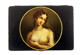 Rechteckige Dose. In schmalem, goldgerahmtem Rundmedaillon: Junge Schöne mit Lockenfrisur, Schleier und Perlenkette.