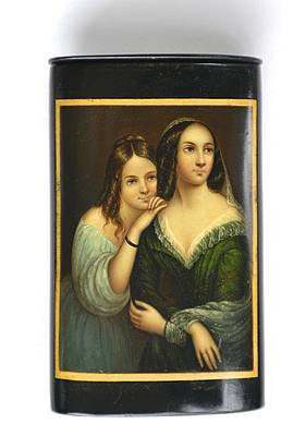 Zigarrenetui mit Messingscharnier, schwarz lackiert. Auf der Schauseite in mit glatter Goldleiste gerahmtem Rechteckfeld: Die großfürstlichen, russischen Schwestern Anna Petrovana Lopuchina (1777-1805) und Katharina Ptrovana Lopuchia (1783-1830). Malerei nach einer Vorlage von George Henry Harlow (1787-1819).