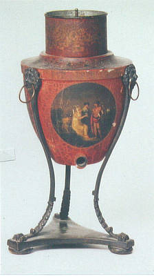 Rot lackierter, vasenförmiger Samowar auf Dreiecksfuß auf gedrückten Kugeln, Löwenköpfen mit Messingringen im Maul und schlanken, gebogenen Stützen mit Blattornamenten und Löwenklauen. Auf der Vorder- und Rückseite mythologische Darstellungen in Rundmedaillons. Stöfchen und Deckel fehlen.