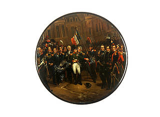Runde Dose mit Napoleons Abschied von der Kaiserlichen Garde am 20. April 1814 in Fontainebleau. Malerei nach einer Stichvorlage von Jean- Marie Jazet (1788-18719) nach einem Gemälde von Horace Vernet (1789-1863). Anmerkung: Napoleon, der sich 1814 in Fontainebleau aufhielt, verließ seinen Palast im April dieses Jahres, um danach in die Verbannung nach Elba geschickt zu werden. Seine Abschiedsrede, die er damals vor seiner Abreise hielt, soll die Kaiserliche Garde damals zu Tränen gerührt haben.
