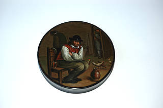 Runde Dose mit Blick in eine niederländische Bauernstube mit einem sitzenden Bauern. Neben ihm ein großer Krug und einige Hühner, im Hintergrund eine halbgeöffnete Tür mit einem weiteren Mann. Malerei nach einer Vorlage von Adriaen van Ostade (1610-1684).