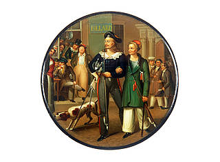 Runde Dose mit zwei Studenten der Schlagenden Verbindung mit Degen und langen Tabakspfeifen. Im Vordergrund ein gescheckter Hund. Im Hintergrund diskutierende, ausgelassene Gesellschaft vor einem Billard-Salon.