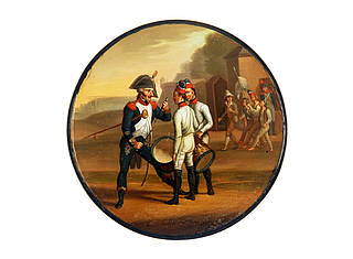 Runde Dose mit einem uniformierten Tambourmajor mit Trommelstöcken und Trommel sowie zwei weiteren jungen Trommlern auf einem Kasernenhof. Weiter hinten vorüberziehende, junge Zivilistengruppe mit Fahne. Malerei vermutlich nach einer Vorlage von Horace Vernet (1789-1863).