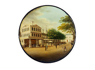 Runde Dose mit der Ansicht der Alten Ratswaage in Hamburg. Dahinter das Gebäude der Hamburger Börse. Reiche Personenstaffage. Malerei nach dem Stahlstich "Die Börse" (1822) von Friedrich Geißler (1778-1853).