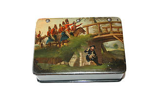 Kastenförmige Dose mit zwei Schnupftabaksbehältnissen auf Ober- und Unterseite. Auf dem Deckel: Friedrich II. sucht nach der Schlacht von Hohenfriedberg unter einer Brücke Zuflucht vor den Panduren. Im Innern des Deckels: Schlachtendarstellung mit dem König auf seinem Schimmel. Im Innern des Bodens: Kleine Stadt am Fluß mit Figurenstaffage. Sehr ungewöhnliche Doppeldose mit bemaltem Deckel sowie zwei bemalten Innenseiten von Deckel und Boden.