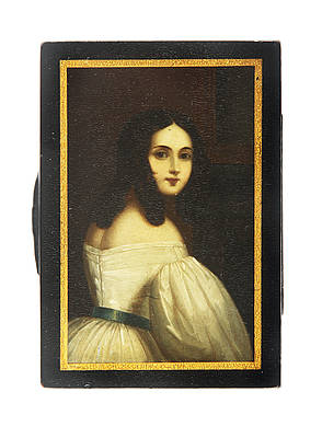 Rechteckiges Zigarrenetui mit Hüftbild einer jungen, sich umblickenden jungen Schönen mit Rückendecolleté, Gürtel und großem Puffärmel. Darstellung in glatter Goldumrandung. Ungewöhnlich scharfkantige Rechteckform mit Daumenrast.