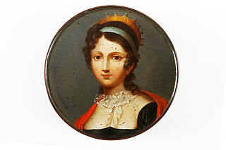 Runde Dose mit einem Bildnis einer jungen Frau mit hochgeschlossener Bluse, um die Schulter gelegtem Tuch, einem Haarband und einer Krone. Vermutlich Porträt der preußischen Königin Luise (1776-1810).