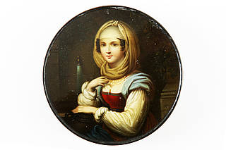 Runde Dose mit dem Bildnis einer jungen Frau mit üppig verschlungenem Kopftuch sowie einem unter den Armen gebundenem Schultertuch am Tisch.