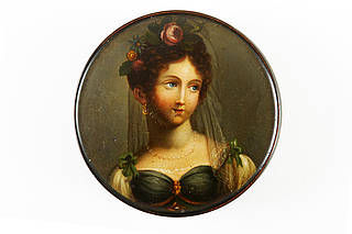 Runde Dose mit dem Bildnis einer jungen Frau mit Schleier, rosengeschmücktem Haar und über dem Busen drapierten Kleid mit Schleifenbesatz und Perlenkette.