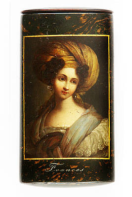 Rechteckiges Zigarrenetui mit ovalförmiger Grundfläche. Auf der Schaufläche in goldfarbener Umrandung: Junge Frau mit üppigem Turban, geschlungenem Tuch und üppigem Spitzendekolleté. Dosenkorpus mit schwarz-grüner Marmorimitation mit Goldsprenkeln.