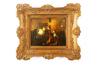 Gerahmtes Gemälde mit Blick in einen Pferdestall, in welchem ein Schimmel und zwei Ziegen untergebracht sind. Malerei nach einer Vorlage von Albrecht Adam (1786-1862). Reich verzierter, vergoldeter Rahmen der Zeit.