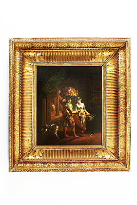 Rechteckgemälde mit einer Marktszene mit einem Gefügel- und Wildbrethändler mit großem Geflügelkorb auf dem Kopf, der einer Frau mit Einkaufskorb eine Ente zum Kauf anbietet. Hinter ihm ein an einem toten Hasen schnüffelnder Hund. Im Hintergrund in einem Gewölbe ein weiterer Mann.