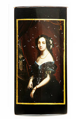 Rechteckiges Zigarrenetui mit abgeflachten Seitenteilen. In schmaler Goldumrandung: Junge Schöne im Festtagskleid mit Blumenschmuck im Haar und Perlenkette. Am Handgelenk ein von ihr gerade zurechtgerücktes Armband.