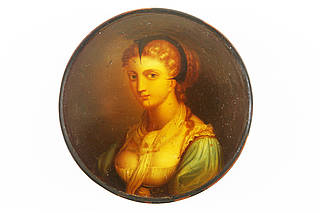 Runde Dose mit einem Bildnis einer jungen Frau mit Hochsteckfrisur, dunkler Haube mit auslaufenden Spitzen, tiefem Decolleté, fliessendem Schal und Puffärmeln am Kleid. Neutraler Hintergrund. Malerei nach einer Vorlage von Angelika Kauffmann (1741-1807).