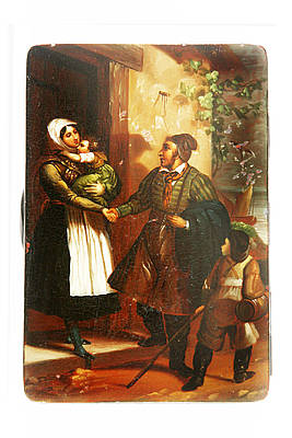 Rechteckige Dose mit einer Abschiedszene. Ein Fischer mit seinem Sohn, der sich vor der Tür des Fischerhauses von seiner Frau und einem weiteren Kind verabschiedet. Im Hintergrund Flußlandschaft mit Segelboot.
