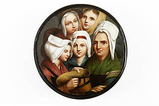 Runder Dosendeckel mit später hinzugefügtem Dosenboden. Kopfassemblage mit fünf Frauen aus den französischen Savoyen mit unterschiedlichen Kopfbedeckungen. Eine von ihnen mit Strohhut in Händen. Malerei nach einer Vorlage von Louis Leopold Boilly (1761-1845).