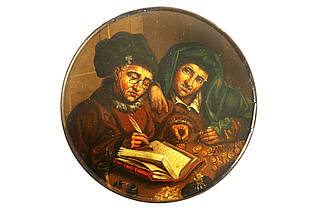 Runde Dose mit zwei geldzählenden, älteren Männern ("die beiden Geizhälse"). Einer von ihnen mit großem Rechnungsbuch, Schreibfeder und Samtbarett, der andere, ersterem Anweisung erteilend, mit üppiger, tuchartiger Kopfbedeckung. Malerei nach einer Vorlage von Quentin Massys (1543-1589).