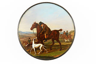 Runde Dose mit vier Reitern mit Windhunden in hügeliger Landschaft.