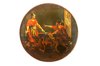Runde Dose mit einer Szene aus der Römischen Geschichte. Augustus, der erste römische Kaiser (63 v. Chr.-14 n. Chr.), im Streit mit Antonius, mit welchem er 42 v. Chr. Brutus und Cassius besiegte.