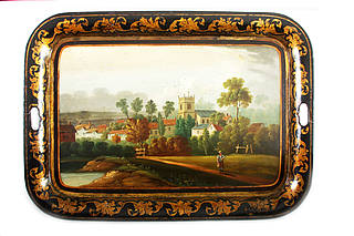 Rechteckiges Tablett mit abgerundeten Ecken. Ausgesparte Handhaben in mit floralen Goldornamenten dekorierter Fahne. Im Spiegel romantische, englische Landschaft mit Häusern und einer Kirche. Im Vordergrund ein kleiner See und Personenstaffage. Malerei nach einer Vorlage von Henry Moseley (Lebensdaten unbekannt).