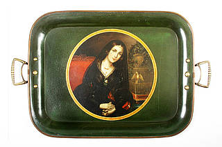 Rechteckiges Tablett mit abgerundeten Ecken. Umlaufende, vergoldete Metallleiste sowie Metallnieten. Vergoldete Bronzegriffe. In runder Goldumrandung: Interieurszene mit einer auf einem Sessel sitzenden, dunkel gekleideten jungen Witwe mit Trauerschleier, Trauerschmuck, einem Vogel in der Hand. Ein weiterer Vogel im geschlossenen Käfig.