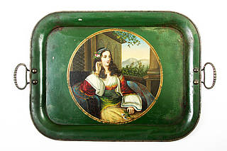 Rechteckiges Tablett mit abgerundeten Ecken. Tabletteinfassung und Nieten aus vergoldetem Metall. Griffe vergoldete Bronze. In schmalem, runden Goldrand: Junge, schöne Orientalin auf der Trerrasse in Festkleidung. Im Hintergrund Berglandschaft.