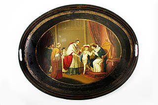 Ovales Tablett mit ausgesparten Handhaben im schräg ansteigenden Tablettrand. Im Spiegel in ovalförmigem, mit schmaler goldfarbener Bordüre umrandeten Medaillon: Blick in einen Thronsaal mit dem von Richard III. angeordneten Verabschiedungszeremoniell des jungen angelsächsischen Königs Edward IV. (reg.1461-1483) von seiner Mutter. In seinem Gefolge ein Kardinal und weitere Personen.