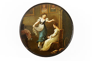 Runde Dose mit einer Szene aus Carl Maria von Webers Oper "Der Freischütz". Die niedergeschlagene, auf einem Stuhl sitzende Förstertochter Agathe lauscht dem aufmunterdem Lied ihrer jungen, tanzenden Verwandten Ännchen.