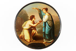 Runde Dose mit einer Szene aus der griechischen Mythologie im Freien, bei welcher der junge Heros Theseus seiner Mutter Aithra den Stein zeigt, unter dem sein Vater, der Gott Poseidon, für ihn ein Schwert und seine Sandalen versteckte.