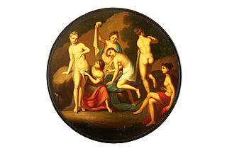Runde Dose mit sechs mit Tüchern verhüllter Nymphen beim Baden am See in freier Felslandschaft. Malerei nach einer Vorlage von Christian Wilhelm Ernst Dietrich, genannt Ditricy (1712-1774).