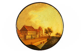 Runde Dose mit Blick auf ein Häuserensemble am Fluß in der Nähe von Dresden. Rechts eine Wiese mit Weidenbäumen. Personenstaffage.