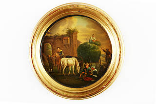 Runder Dosendeckel einer ehemaligen Lackdose. Heuernte mit vollbeladenem Heuwagen, arbeitenden und rastenden Bauern mit ihren Pferden vor einer Burgruine.