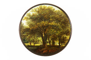 Runde Dose mit mächtiger Eiche im Vordergrund. Dahinter Fluß mit Personenstaffage sowie Blick in eine Waldlichtung und dichten Eichenwald. Malerei im Stil des Pascha Johann Friedrich Weitsch (1723-1803).