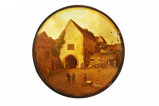 Runde, ungewöhnlich hohe Dose mit Blick in einen Schloßhof. Im Zentrum ein größeres Wirtschaftsgebäude mit Toreinfahrt. Daran anschließend weitere Wirtschaftshäuser. Personenstaffage. Malerei nach einer Vorlage des englischen Architektur- und Landschaftsmalers Frederick Wilton Lichtfield Stockdale (18./19. Jh.).