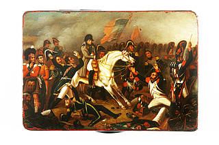 Rechteckige Dose mit einer Szene aus der Schlacht von Waterloo am 18. Juni 1815. Napoleon zu Roß nach der Niederlage seiner Truppen. Malerei nach einer Druckgraphik von Jean-Pierre-Marie Jazet (1788-1871) nach der Vorlage von Karl-August Baron von Steuben (1788-1856). Im Dosendeckel wurde fälschlicherweise Vernet angegeben.