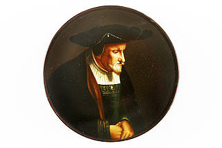 Runde Dose mit dem Bildnis eines Edelmannes im Kostüm der Renaissancezeit. Weißes Hemd mit Halskrause, grünes Wams mit Goldborte, rotem Schal, dunklem Mantel und großem Samtbarett.