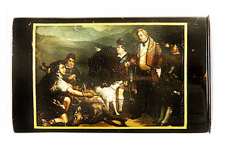 Rechteckiges Zigarrenetui mit geradeflächigen Seitenteilen. In schmaler Goldrahmung: Schottische Jagdgesellschaft im Freien mit erlegtem Hirsch. Malerei nach einer Vorlage von Sir Edwin Henry Landseer (1802-1873).