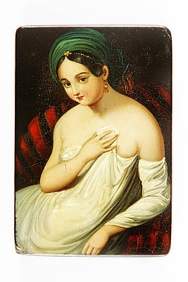 Rechteckige Dose mit junger, mit einem Tuch bekleideter Orientalin mit strenger Mittelscheitelfrisur und Turban auf gestreiftem Kanapée. Anmerkung: "IPH" steht für die Nürnberger Lackmanufaktur von Iohann Paul Hahn.